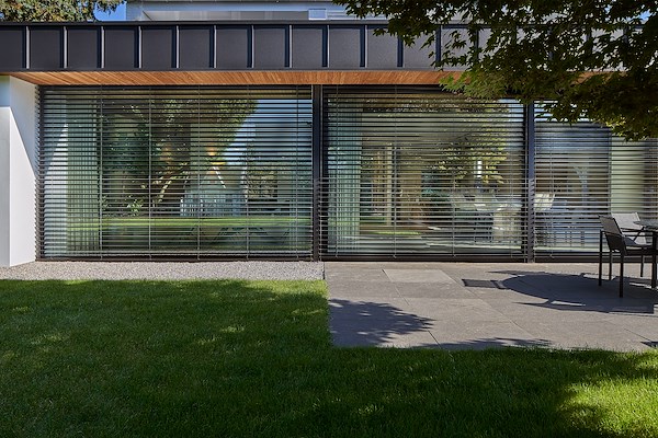 De woonkeuken is het hart van de begane grond geworden. Een verlaagd plafond van houten latten – geïnspireerd op de schrootjesplafonds uit de jaren ’60 en ’70 – markeert de keukenzone en geeft die warmte en intimiteit. Tegelijk lost het plafond een technisch probleem op: een stalen draagbalk voor de bovenliggende vloer is volledig in het lattenwerk geïntegreerd. Je ziet hem niet, maar hij doet zijn werk.Het houten plafond loopt door naar buiten, onder een overstek dat de op het zuiden gelegen aanbouw beschermt tegen oververhitting in de zomer. In de winter laat de laagstaande zon het licht juist diep naar binnen vallen. Gordijnrails en buitenzonwering in aluminium lamellen zijn in het plafond verwerkt – zichtbaar als het moet, onzichtbaar als het kan.