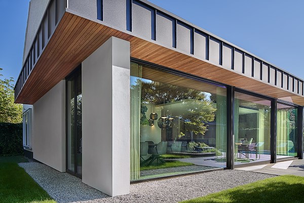 Bij een verbouwing van een villa uit deze periode loop je tegen bouwkundige beperkingen aan. De bestaande vloeren zijn opgebouwd uit holle baksteenvloerelementen – een constructie die je niet zomaar kunt openbreken. Een aanbouw over de volle breedte van de achtergevel was noodzakelijk om de gewenste ruimte te maken, maar de draagstructuur van de bovenverdieping moest intact blijven.Een volledig glazen achtergevel lag voor de hand, maar levert in de praktijk problemen op: te veel inkijk, oververhitting in de zomer, en een ruimte die kil aanvoelt in plaats van warm. De ontwerpopgave was om de openheid te creëren zonder die nadelen erbij te krijgen.