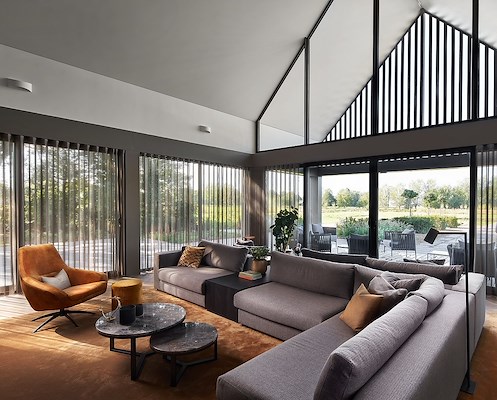 De gevels zijn bekleed met padoekhout, een duurzame houtsoort die van roodbruin naar zilvergrijs vergrijst. Die vergrijzing is geen slijtage maar onderdeel van het ontwerp – de woning krijgt in de loop der jaren meer diepte en karakter.Het rieten dak is zowel esthetisch als functioneel. Het isoleert uitstekend, zowel thermisch als akoestisch, en geeft de woning een ambachtelijke uitstraling die past bij de landelijke omgeving. De combinatie van riet, padoekhout en aluminium kozijnen maakt het huis herkenbaar zonder schreeuwerig te zijn.