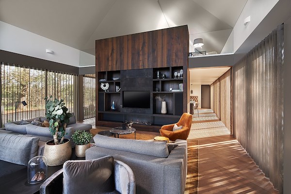 De woonkamer heeft een open nok – het plafond loopt door tot in de kap, waardoor een indrukwekkende hoogte ontstaat. Grote glaspartijen aan drie zijden geven panoramisch uitzicht over het landschap. Een op maat gemaakt meubel met geïntegreerde haard scheidt de woonkamer van de keuken zonder de ruimte te breken. Het meubel draagt geen constructie, het definieert zones.Boven de woonkamer ligt een open werkplek met zicht over het landschap. Bereikbaar via een vide, bruikbaar als thuiswerkplek of studieruimte.