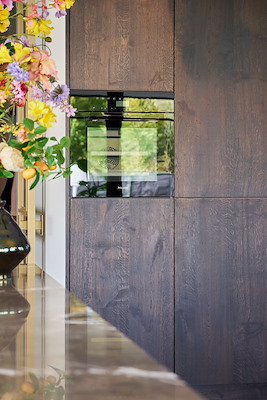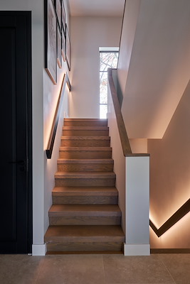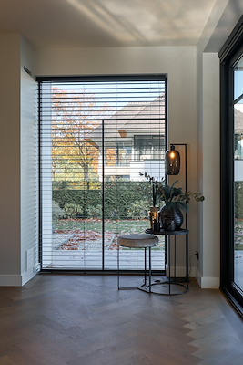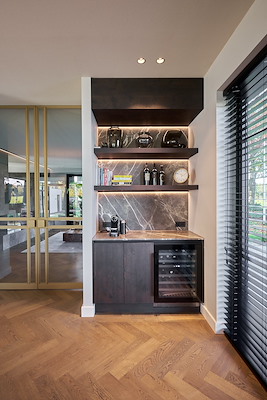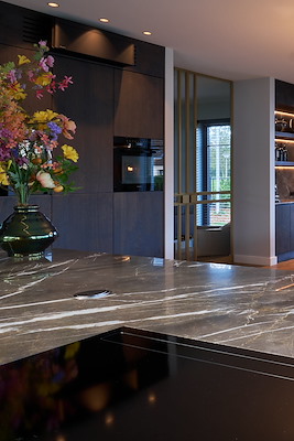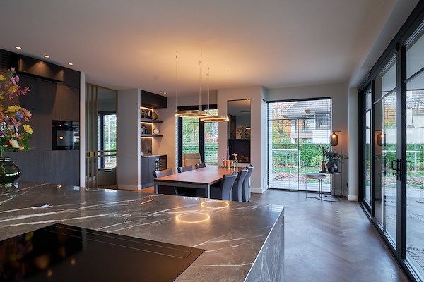 De woonkeuken is het hart van het huis. Een groot kookeiland, een kastenwand en een eettafel met zicht op de tuin door grote ramen. Een open haard scheidt de keuken visueel van de eetruimte – warmte en sfeer zonder muren.De woonkamer is via dubbele stalen deuren verbonden met de woonkeuken. Die deuren zijn er niet voor de sier: ze maken de woonkamer tot een besloten ruimte die je kunt afsluiten van de rest van de begane grond. Dat geeft flexibiliteit in de indeling en rust als je die nodig hebt.Aan de woonkeuken grenst een bijkeuken met doorloop naar de speelkamer – een ruimte met grote ramen op de tuin, bruikbaar als speelplek, studieruimte of tv-kamer. De positionering is bewust: de kinderen zijn dichtbij maar niet in de woonkeuken.