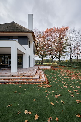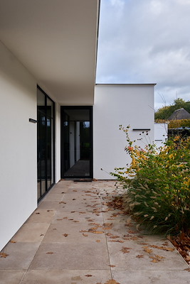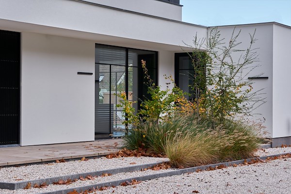 Zowel de woonkamer als de woonkeuken hebben directe toegang tot buiten. Aan de zijkant ligt een groot terras op de zon. Aan de achterzijde een overdekte veranda – beschut, bruikbaar in elk seizoen en gericht op de tuin. De overgang tussen binnen en buiten is bewust laagdrempelig gehouden: grote schuifpuien, dezelfde vloerhoogte, en een overstek dat schaduw geeft in de zomer.