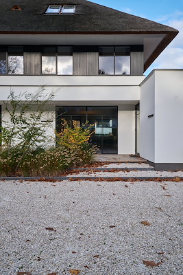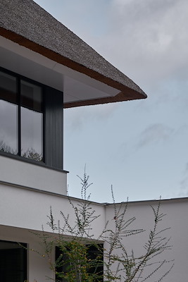 De gevel is opgebouwd uit drie lagen. Een beigetinten plint verankert de woning visueel op het kavel. Daarboven wit gevelstucwerk als hoofdmassa – strak, tijdloos en een scherp contrast met het groen van de omgeving. Onder het royale overstek van de rieten kap zit zwarte verticale houten gevelbekleding die een moderne laag toevoegt aan de traditionele dakvorm.Het rieten dak is meer dan uitstraling. Het isoleert uitstekend en geeft de woning zijn silhouet. De woning is verder voorzien van hoogwaardig isolerend glas, vloerverwarming en is voorbereid op zonnepanelen.