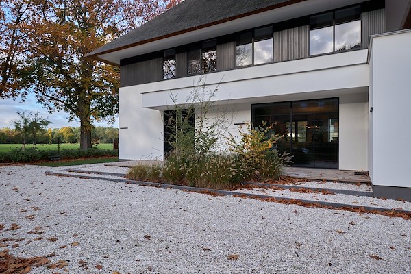 De villa staat bewust hoger dan het maaiveld. Dat doet twee dingen: het geeft de woning een sterkere presentatie naar de straat, en het verbetert het uitzicht vanuit de begane grond over de omliggende tuinen en het groen van Tegenbosch. Vanuit elke kamer op de begane grond is het landschap voelbaar aanwezig.