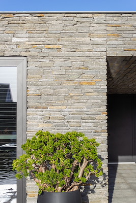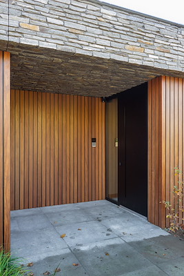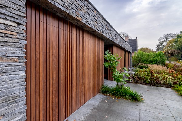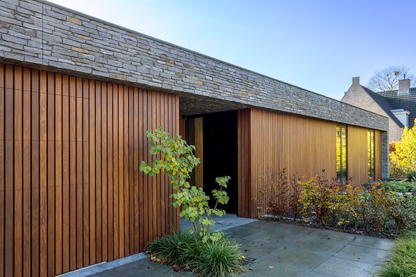 De voorgevel is dicht. Geen grote ramen, geen inkijk vanaf de straat. Dat is een bewuste keuze die twee dingen doet: het geeft de bewoners privacy en het maakt de achterzijde des te sterker. Daar opent de woning zich volledig met grote glazen puien naar de tuin. Het contrast tussen voor en achter is de architectonische drager van het ontwerp.