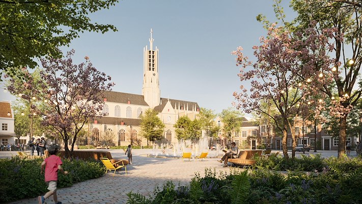 Door de rijbaan te verleggen ontstaat meer ruimte voor terrassen, verblijf en ontmoeting. Grote, strategisch geplaatste bomen beperken hittestress en versterken de stedelijke biodiversiteit. Een waterelement verwijst subtiel naar het vestingverleden van Hulst en brengt verkoeling en spel op het plein. Rondom de basiliek opent de tuinmuur zich veel verder naar de markt, waardoor het Hemels Hof als luw groen tegenwicht deel wordt van de publieke ruimte.