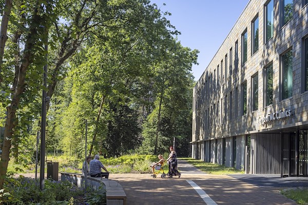 Door grote ramen valt het zonlicht gefilterd naar binnen. Schaduwen van beukenbomen tekenen zich scherp af, de wind beroert zacht de bladeren. Tergooi MC in Hilversum is een ziekenhuis in een bos. Zorg en behandeling vinden hier letterlijk midden in het groen plaats. Bijna elke kamer, gang of wachtruimte kijkt uit op de bosrijke omgeving: bomen, leven, de seizoenen die elkaar opvolgen. BoschSlabbers ontwierp de buitenruimte als een vanzelfsprekend vervolg van het gebouw – waar binnen en buiten in elkaar overlopen, met groen tot aan het bed van de patiënt. In samenwerking met Wiegerinck Architecten en SVP.