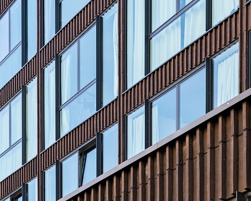 Naast het lagere gewicht en de acceptatie door de Stichting Gevelgarantie, leverde de keuze voor de opbouw met HSB en Knauf AQUAPANEL® Cementboard Outdoor nog een aantal extra voordelen op. In tegenstelling tot metselwerk kan het aanbrengen van steenstrips heel precies worden uitgemeten. Dat heeft een veel strakker beeld opgeleverd. Daarnaast kon er door de combinatie van geprefabriceerde HSB-elementen en in het werk gemonteerde AQUAPANEL® Cementboard Outdoor platen een stuk sneller worden gebouwd. Daardoor kostte de switch naar de lichtere constructie geen extra tijd. Maar misschien nog wel de grootste bonus is dat het systeem voor een aanzienlijker slankere gevel heeft gezorgd. Vooral voor opdrachtgever Caransa Groep was dat goed nieuws. Die zag door deze aanpassing het woonoppervlak van de appartementen toenemen. Zeker in de binnenstad van Amsterdam is elke vierkante meter extra een groot goed.
