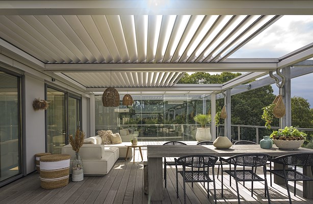 Met het opengeschoven lamellendak blijft het terras volledig verbonden met de buitenlucht; gesloten ontstaat een beschutte en comfortabele omgeving.
