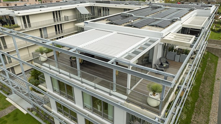 Dronebeeld van penthouse terras met inschuifbare lamellendaken en vast glasdak