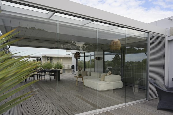 Aan één zijde is een glazen schuifwand toegepast met een verschuifbaar louvre paneel uit de STELLA CORNELS® Glass lijn. Het glas zorgt voor uitzicht en transparantie. Het verschuifbare louvre paneel maakt het mogelijk om zoninstraling gericht te weren.