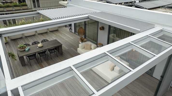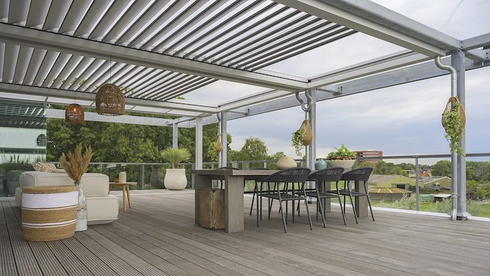 Flexibel dak met verschuifbare lamellen voor optimale zonregeling en ventilatie