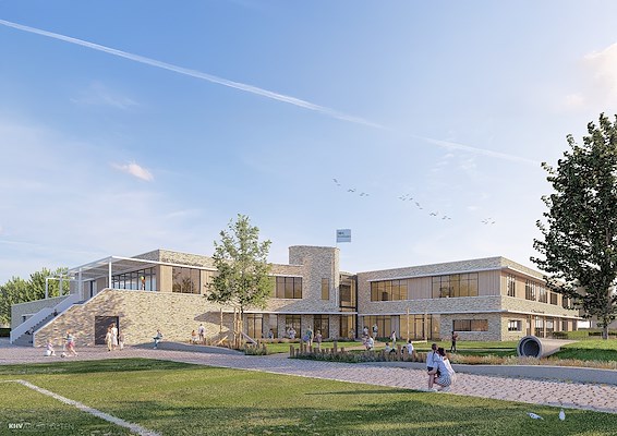 Een tweede belangrijk thema is de sterke relatie tussen binnen en buiten. Het MFC opent zich naar de omgeving en maakt buitenruimtes integraal onderdeel van het gebruik. Buitenlokalen bij de onderbouwpleinen, een goed gepositioneerd terras en pleinen die aansluiten op de ontmoetingsruimten zorgen ervoor dat leren, spelen en ontmoeten zich niet beperken tot het interieur. Deze overgangszones versterken de gebruikskwaliteit en dragen bij aan een vanzelfsprekende ontmoeting tussen gebruikers en het dorp.