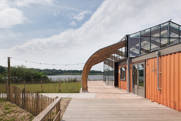 Vier hergebruikte 40ft highcube zeecontainers worden in de spantenconstructie geschoven en vormen de basis van de geïsoleerde kern. Hierin is ruimte voor de keuken en het winterterras. Met een vliesgevelconstructie worden de spanten ingepakt, geïnspireerd op de tuinkassen. Zo ontstaat het terras dat in het voor- en najaar gebruikt zal worden. Buiten komen er vlonders van hergebruikt hout, deze vormen het zomerterras. De drie zones die hierdoor ontstaan; winter – lente/herfst – zomer dragen bij aan het duurzame karakter. Door aan te sluiten op het gebruik door de seizoenen heen, hoeven niet alle ruimtes geïsoleerd en/of water- en winddicht te zijn en kan er op materiaal bespaard worden.