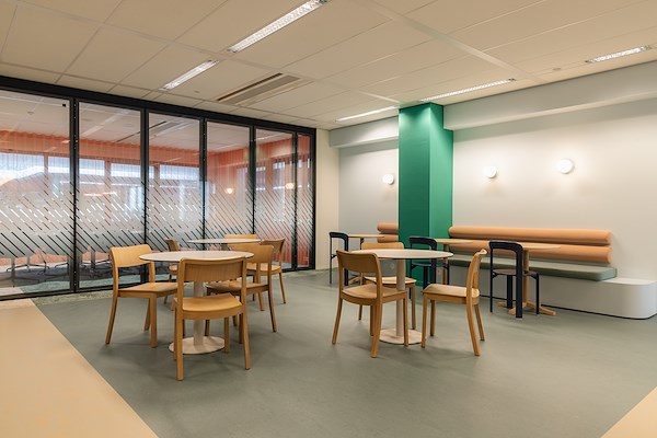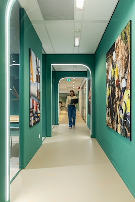 In de gangen, informele ontmoetingsplekken én het workcafé is gekozen voor Marmoleum Concrete in de kleuren 3712 en 3752. Deze natuurlijke linoleumvloer combineert een eigentijdse minerale uitstraling met subtiele kleurnuances. De vloer sluit naadloos aan bij het grafische en kleurrijke interieur dat is geïnspireerd op de verschillende huisstijlen van de aangesloten netbeheerders. Door gericht kleurgebruikontstaat herkenbaarheid per ruimte, zonder de samenhang te verliezen.