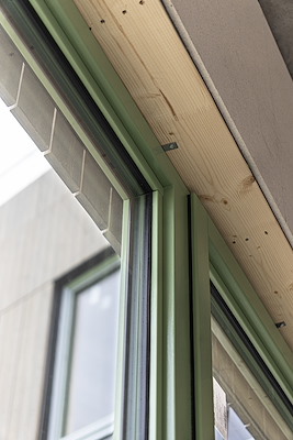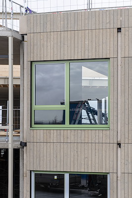 . De kozijnen zijn uitgevoerd met een larikshouten binnenzijde, een aluminium buitenzijde en triple glas. Daarmee sluiten ze goed aan op de duurzaamheidsambities van het project. De bleekgroene afwerking op zowel hout als aluminium zorgt voor een rustig en consistent gevelbeeld.