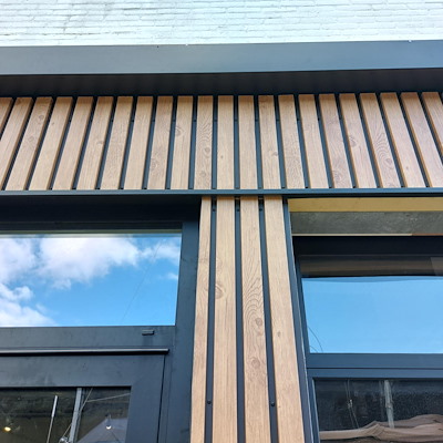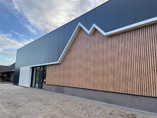 . Het ontwerp combineert warme houttinten met subtiele matzwarte accenten, wat resulteert in de verfijnde uitstraling van een geventileerde houten gevel.