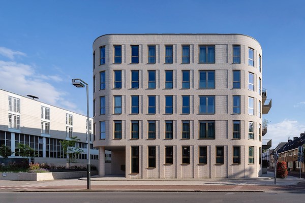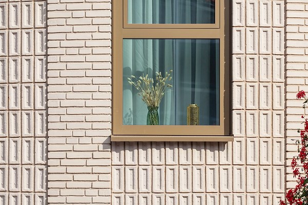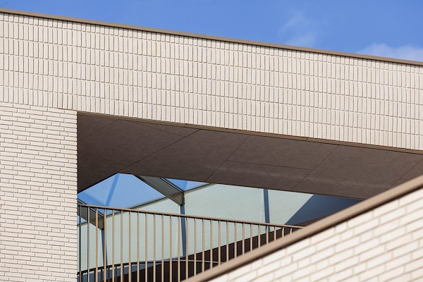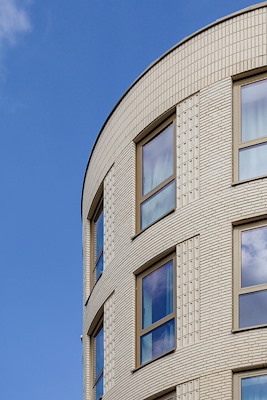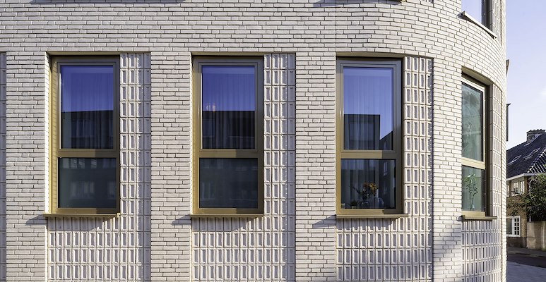 Voordat Résidence Gooiland gerealiseerd was, was de locatie en open parkeerterrein voor onder andere het naastgelegen hotel maar ook andere horeca. Deze parkeergelegenheid is nu ondergronds gevestigd. Rondom het gebouw zijn er wel nog ruime stroken lege ruimtes overgelaten. Op deze manier komen de omliggende gebouwen met hun functies nog wel tot hun recht en ontstaan er ruimere plekken met veel lichtinval Het complex bestaat uit rondgebogen bouwvolumes van wel vijf bouwlagen hoog. Om het ontwerp te kunnen inpassen tussen ook de lagere omgelegen woongebouwen is er een inham gemaakt in het midden van het gebouw. Dit lagere dak wordt nu benut als buitenterras voor de bewoners. Voor dit ontwerp is een lichte baksteen kleur gekozen, ook wel de ivoorkleurige Wit Wasserstrich gevelsteen uit onze Black & White Shades Collectie. In combinatie met de rondgebogen gevels zorgt dit voor een perfect samenspel en een harmonieuze overgang tussen het nieuwe complex en het historische buurtgebouw. Het creëert enerzijds een verbinding en respecteert aan de andere kant juist de al bestaande architectonische context. In detail, is er iets unieks aan deze gevel wat zorgt voor een stuk meer dynamiek. Zo zijn delen van de bakstenen gevels voorzien van bakstenen met de achterzijde als zichtzijde. Hierdoor zijn er vierkante holtes te zien en geeft het de gevel veel meer reliëf. Door dit opnieuw af te wisselen met normale- en andere metselrichtingen heeft dit een betoverende gevel gecreëerd