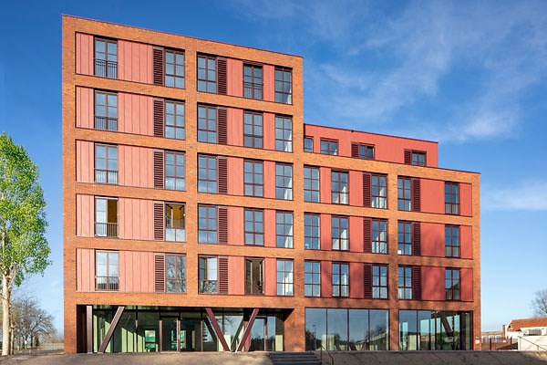"Het metselwerk in rastervorm en de verfijnde aluminium kozijnen refereren naar de bedrijvigheid die hier vroeger heerste. Daarnaast valt het ontwerp ook op door de diepe, genuanceerde roodtinten die naadloos opgaan in de couleur locale'."
