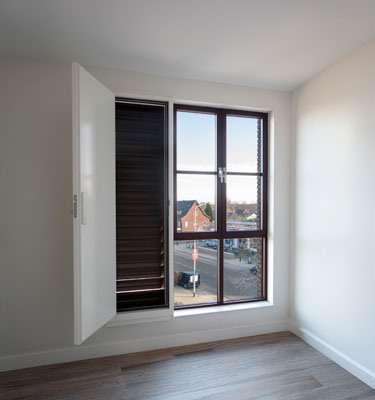 niet 'tegen' de gevel geplakt worden, maar er onderdeel van uitmaken. Hierdoor vormen de gevelbeplating, de raamopeningen en de ventilatie-units één integraal en strak geheel.