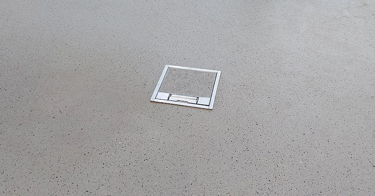De afwerking is uitgevoerd met een compacte RVS S15 deksel (170x170 mm), wat zorgt voor een strak en duurzaam eindresultaat dat naadloos opgaat in de vloer.