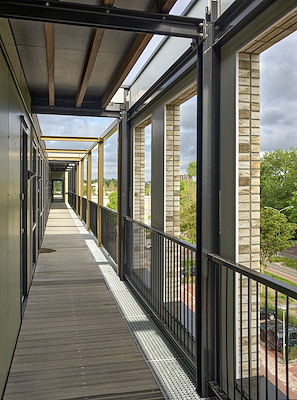 De gevel is opgebouwd uit een circulair gevelsysteem met glas- en houtelementen en sluit aan bij de biobased ambitie van het project. Binnen dit type houtbouw spelen ook gevelafwerking en isolerende schillen een belangrijke rol in het waarborgen van duurzaamheid en comfort.
