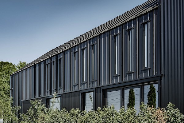De gevel is uitgevoerd in de kleur Colorcoat Prisma® Kronos, terwijl de lamellen zijn uitgevoerd in Black Glans. Dit zorgt voor een fraai en krachtig contrast. De binnenzijde van de sandwichpanelen is uitgevoerd in FALK zuiver wit (RAL 9010): een heldere, frisse kleur die de ruimtelijkheid van het interieur benadrukt.