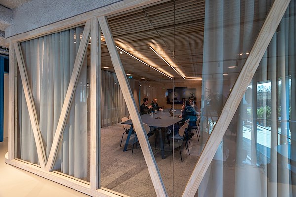 De keuze voor hout in de frames versterkt het warme en natuurlijke karakter van de ruimte en vormt een expliciet contrast met het strakke glas en de technische precisie van het wandsysteem. Dit samenspel van materialen maakt de systeemwand tot een verbindend element tussen architectuur en interieurontwerp.Voor architecten is hier duidelijk zichtbaar hoe een systeemwand kan worden afgestemd op de bredere materialisatie van een interieur: niet als losstaand product, maar als maatwerkoplossing binnen een samenhangend ontwerpconcept.