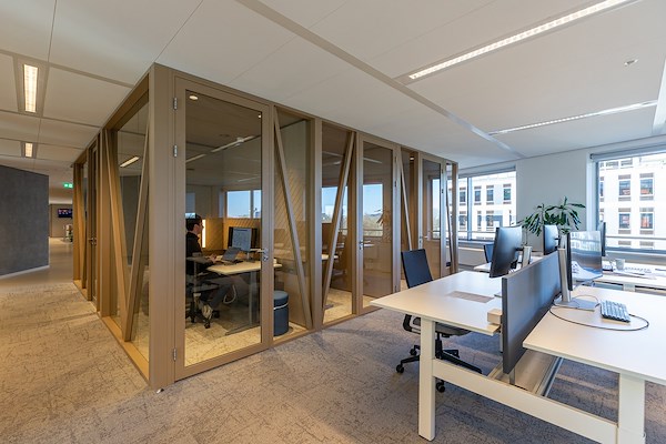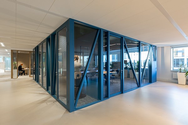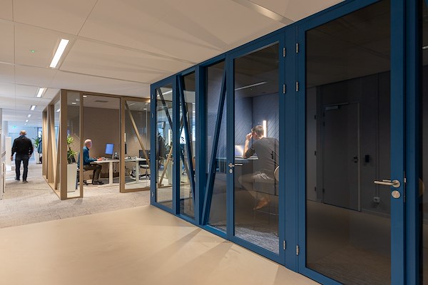 Ballast Nedam zijn scheidingswanden nadrukkelijk ingezet als ontwerpdrager in plaats van uitsluitend als functioneel element. De systeemwanden maken integraal deel uit van het ruimtelijk concept en geven het interieur een herkenbaar, eigen karakter. Door een zorgvuldige combinatie van glas, staal, melamine en opvallende diagonale frames ontstaat een krachtige architectonische taal die structuur en dynamiek toevoegt aan de werkomgeving.