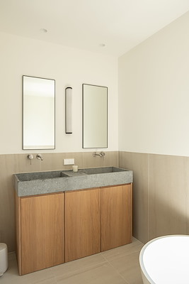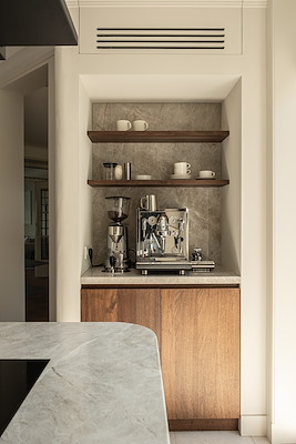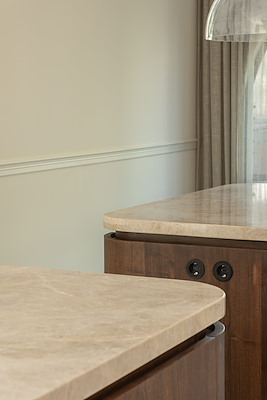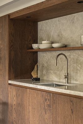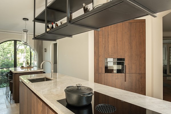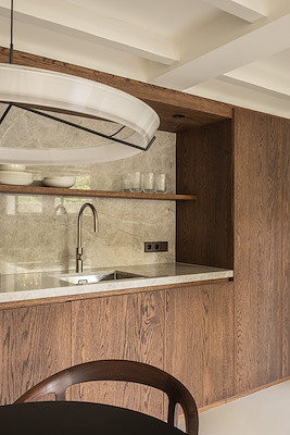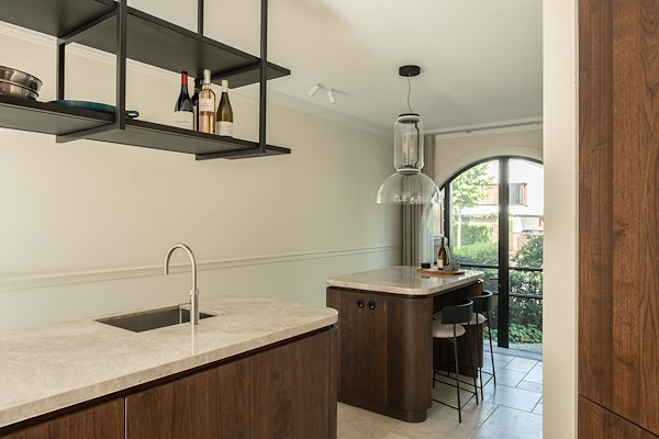 Warme houtsoorten, natuursteen en subtiele metalen accenten zorgen voor een gelaagde en rustige beleving. Maatwerkmeubilair vormt hierbij geen toevoeging maar een integraal onderdeel van de architectuur, alsof het altijd al deel heeft uitgemaakt van de woning.