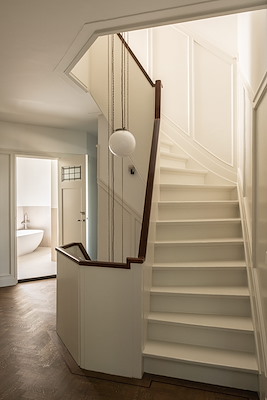 hier licht, lucht en verbinding toegevoegd. Een nieuwe trap, zorgvuldig geïntegreerd in de bestaande trappartij, maakt de relatie met de rest van het huis vanzelfsprekend.