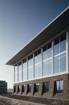 Aan dit klassiek ogende vrijstaande kantoorgebouw ligt een eenvoudige plattegrond ten grondslag met een stramien van 3 x 3m. De gevels, die aan alle zijden gelijk zijn, worden gevormd door een schuin uitlopende plint van gestapelde leistenen en door grote glasvlakken afgewisseld met witte ronde aluminium kolommen over de eerste en tweede verdieping. De gevels worden afgesloten door een ruim overhangende betonnen dakrand. Het kantoor wordt betreden via een portaal bedekt met een stalen antracietkleurige luifel en voorzien van een donkergroene aluminium pui. Het gebouw is geplaatst op een terp die oorspronkelijk bedoeld was als parkeerruimte maar nu gedeeltelijk wordt ingenomen door een kelder.