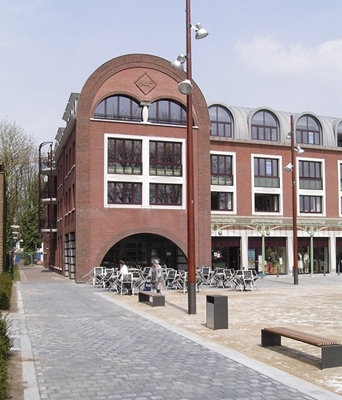 Het ontwerp is geïnspireerd op enerzijds de baksteenarchitectuur in de omgeving en anderzijds motieven als arcades en portico’s, zoals die op pleintjes in buitenlandse steden veel voorkomen. Verschillende metselverbanden en reliëfs, toogvormen, geprofileerd lijstwerk, slanke spanten en hekwerken geven het gebouw een verzorgd en tijdloos karakter. Er is gekozen voor een lichte en een donkere rode baksteentint, gecombineerd met stenen met een ruw oppervlak. De rond bekroonde gevels hebben reliëf in het metselwerk, als monumentaal accent. In de rode baksteentinten zitten helderwitte kozijnen en crèmekleurige geprofileerde stenen lijsten en goten. De kap en de ronde dakkapellen zijn in gefelst zink uitgevoerd.