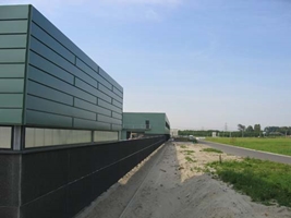 productieprocessen, disciplines en groepsgroottes kunnen voorkomen. Dit heeft geleid tot een zeer helder maar flexibel concept: het centrale magazijn vormt het hart van het gebouw en alle productie- en kantoorafdelingen zijn hier omheen geplaatst. Dit zorgt voor korte transportlijnen en een maximale indelingsvrijheid. Het gebouw is niet opgevat als een ‘kantoor-met-werkplaats’ model maar als een totale eenheid. De beide bouwdelen aan de lange kant van het magazijnblok komen op de kop bij elkaar en ter plaatse van deze ‘botsing’ wordt de hoofdentree gevormd waardoor een specifieke en herkenbare voorgevel ontstaat op bedrijvenpark Fivelpoort.