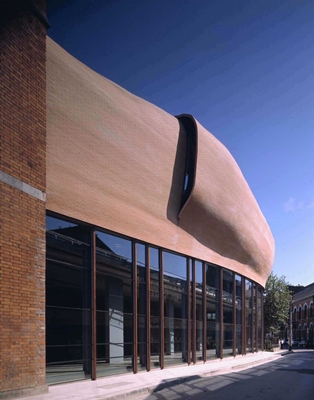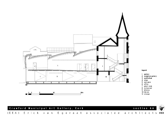 The Crawford Municipal Art Gallery occupies a prominent location in the heart of Cork, a small city in the south of Ireland. Extended a number of times since its construction in 1724, the building has become an amalgam of different types of spaces, none suitable for contemporary or large scale exhibits. The new design adds two new exhibition spaces and improves the gallery circulation by inserting a suspended stair to connect the existing floor levels. The new exhibition spaces are within the former courtyard and have strikingly different atmospheres. The upper gallery’s dramatically shaped roofs create an architectural space filled with natural light. The lower gallery is quieter, with a glazed wall facing the street that can be partially or fully closed by wooden shutters, depending on the requirements of each exhibition. The existing building presented a harmonious exterior through the use of brick throughout. In the new facade, floating curved ribbons of bricks glued together to form monolithic shells articulate the contrast, as well as the harmony, of old and new. Connected through material, but distinctive in form and shape, the intervention adds another layer of history to this cultural landmark.