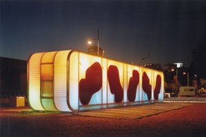 Door de toepassing van een translucente gevel verandert de uitstraling van het paviljoen naarmate de hoeveelheid licht op de gevel valt. Strak wit of schimmig grijs , glimmend of mat. Door de gevel ’s avonds van binnenuit aan te lichten komt het accent op de huid zelf te liggen en is het een soort diapositief van de dagvariant geworden.