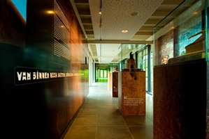 De kleine entree ligt aan het uiteinde van het balkon, tegen de achterkant van de muur. De balie waar men bij binnenkomst direct op stuit, is de spil van de gehele machine. Op dit strategisch gekozen controlepunt begint en eindigt de route door het museum, maar het biedt zicht op de smalle museumwinkel, de trap naar de garderobe en toiletten beneden en op de ingang zelf, alledrie knus naast elkaar gelegen. Met name vanuit akoestisch oogpunt is het handig om de grotere groepen kinderen in eerste instantie buiten te accommoderen, zodat ze goed kunnen worden voorbereid op het eigenlijke museumbezoek.