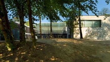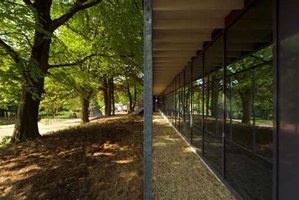 Vanaf de parkeerplaats loopt men een helling af langs de lage, uit zandkleurige baksteen opgetrokken muren van de nieuwbouw, die hun eigenlijke hoogte kunstig weten te verbergen. Daarover zo meer. Vervolgens passeert men een klein, wit en grijsblauw geschilderd houten gebouw met een veranda waar tegenwoordig het museumcafé is gevestigd. Dit was de eerste uitbreiding van het museum dat oorspronkelijk in de vlak naast het terrein gelegen villa was gevestigd. Het houten gebouw heeft een koloniale uitstraling. Bij het café aangekomen draait men een kwartslag en ontvouwt het lommerrijke entreeterrein zich naar achteren. Langs de witte muren van het gedeelte uit 1958 waarin tot voor kort de hoofdingang was opgenomen, loopt men nu naar een lange witte bakstenen muur, die als scherm voor het achterliggend gebouw fungeert. In het scherm zitten twee rechthoekige openingen en een kleine nis, die zich op vriendelijke wijze om een boom heen vouwt. Hierachter bevindt zich de nieuwe entree.