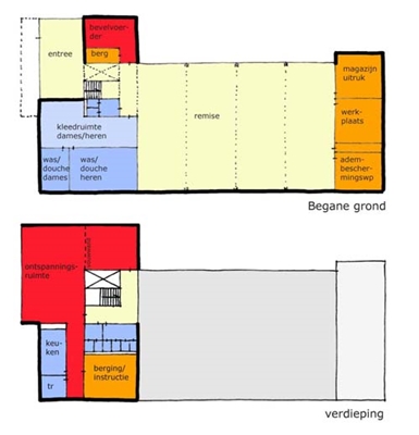 Belangrijk uitgangspunt voor de logistiek van de kazerne is de uitrukpositie van de voertuigen (4-stuks) t.o.v. de toegang van het terrein. Grenzend aan de positie van de voertuigen liggen de werkplaatsen. De voertuigen staan opgesteld in de richting van de (uitruk) transparante (overheaddeuren) gevel. Aan de kop van het gebouw bevindt zich een tweelaagse bouwmassa. Onder het overstek bevindt zich de transparante entree. Vanuit deze entree is directe toegang tot de ruimte van de bevelvoerder, remise, kleedruimten en de bovengelegen verdieping middels de trap. Op de verdieping biedt een laaggelegen raam direct zicht op de naastgelegen remise. Vanuit deze positie kan de ontspanningsruimte worden benaderd. Deze twee ruimten zijn middels een schuifwand separaat te gebruiken. In de ontspanningsruimte biedt de kijker een magnifiek zicht op de omgeving. Tevens bieden schuifdeuren de mogelijkheid om deze ruimte als buitenruimte te gebruiken.