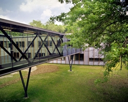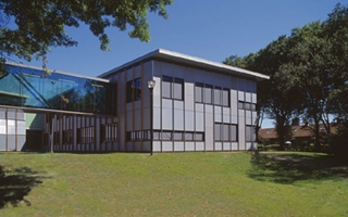 Door houten stijlen, geplaatst iedere 1,20 meter, krijgt de gevel een verticaal ritme. De vlakken tussen de stijlen bestaan uit geëmailleerde glasplaten en vezelcementplaten, waardoor in de gevel een subtiel textuurverschil ontstaat. Dieper in de gevel liggen de kozijnen. Silhouetten van kolommen, regelmatig van buiten af zichtbaar, vormen de achterste laag.