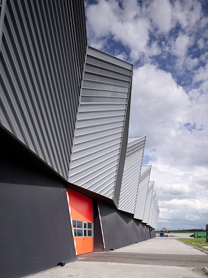 Het gevouwen dak is opgebouwd uit lichte vakwerkliggers, die zonder tussenkomst van kolommen de ruimte overspannen. Zo ontstaat een enorme kolomvrije ruimte waarbinnen vrachtauto’s en bulldozers optimaal kunnen manoeuvreren. Tussen de 4,5 m hoge massieve, betonnen plint en de metalen gevouwen huid van het gebouw vindt natuurlijke ventilatie plaats. De schuine, betonnen plint vormt een functionele keermuur waartegen de containers kunnen worden gestald.
