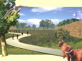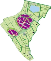 Ontwikkeling van een bedrijfsterrein in een kwetsbaar beekdallandschap langs de A2 in Den Bosch. Compacte en efficiënt georganiseerde bedrijfsclusters liggen als versteende donken in een ecologisch en recreatief aantrekkelijk, extensief agrarisch landschap. (i.s.m./ i.o.v. Ontwerp- en Architectenbureau Von Meijenfeldt, 2001 - 2002)
