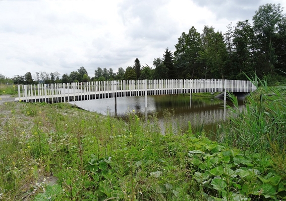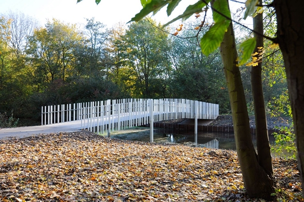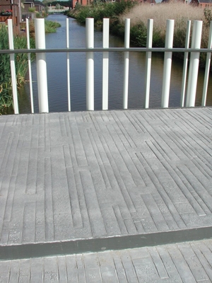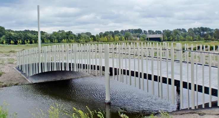 De polderbruggen die nu in het gebied liggen hebben geïnspireerd tot de meest eenvoudige vorm; de betonnen plaat die twee oevers verbindt. Hiermee kunnen alle gewenste vormen gemaakt worden die zich door de context in het gebied aandienen; gebogen en vlakke dekken, smalle en brede bruggen, lange en korte. De rand van de brug is helder gekleurd om de plaat te accentueren.