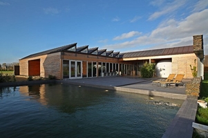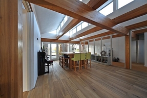 Een sheddak is het antwoord op het diepe gebouw met gesloten buitenmuur. Hierdoor treedt overal in de ruimte veel daglicht toe. De meeste wanden en deuren zijn van glas. Dak en vloer, kasten en keukenblad, overlappen binnen- en buitenruimte. Het dak bevat een ideale zonneboiler.