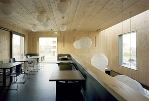 De constructie van het gebouw is innovatief en duurzaam. Er zijn twee geïmporteerde houtbouwsystemen toegepast, 'Lenotec' uit Duitsland voor de wanden (massief verlijmde houten platen) en 'Lignatur' uit Zwitserland voor de vloeren (houten kanaalplaten). De constructieve materialen zijn overal in het zicht gelaten en bepalen in belangrijke mate de ruimtelijke expressie van het gebouw. Perforaties in de houten plafonds zorgen voor een goede akoestiek zonder toegevoegde afwerkingen. Lambriseringen op verschillende hoogtes benadrukken het huiselijke karakter van de verschillende kamers en beschermen het onbehandelde hout.