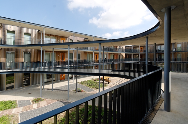 Ook de materialisatie is tweeledig: de buitenzijde is voornamelijk baksteen, de binnenzijde hout. Een samensmelting van de openheid van het modernisme en de beslotenheid van het traditionalisme. Aan de lange zijdes heeft het bouwblok twee openingen gekregen, zodat ook buurtbewoners de binnentuin kunnen betreden zonder het gevoel te krijgen dat ze eigenlijk niet welkom zijn. Tegelijkertijd zorgen de galerijen voor extra beslotenheid doordat ze, halverwege het bouwblok, met elkaar worden verbonden door een luchtbrug. Het zwierige karakter van de galerij creëert ruimte voor de entrees van de woningen. Deze vormen een goede overgang tussen privé en publiek en worden als uitbreiding van de huiskamer gebruikt.