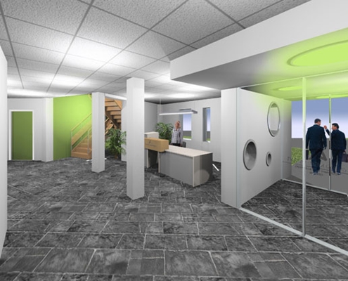 Ten behoeve van de renovatie van het kantoor zijn diverse ontwerpen gemaakt. Het doel van het project is het kantoor een moderner aanzien te geven waarbij verder is gekeken dan alleen de entree. In eerste instantie werd gedacht aan een verbouwing waarbij de entree zou worden verschoven naar de kruising van de twee bouwdelen. Na bepaling van de bouwkosten bleek het plan iets te ambitieus en is gekozen voor een eenvoudiger opzet. Daarbij wordt de bestaande situatie zoveel mogelijk intact gelaten en wordt de entree, gangzone en landschapskantoor ingrijpend aangepakt. Ook wordt er een nieuwe indeling gemaakt voor het landschapskantoor en komt er een extra spreekkamer. De uitstraling is fris en rustig. De kleurnuances lopen door het gehele gebouw.