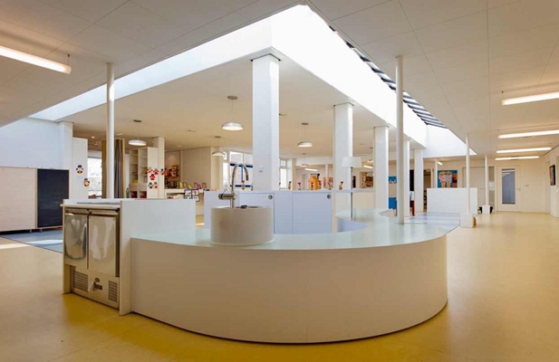 Op de begane grond ligt de nadruk op het spelen. De grote open ruimte die gecre?d is kan men openen naar het schoolplein toe. Lucht en transparantie doorbreken de besloten groepslessen die door een stevige muur van de speelruimte gescheiden zijn. De vormgeving is als een "kloostergang" die heldere grenzen definieert voor "het vrije leven" op het speelterrein.