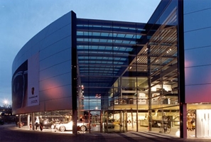 Het winnende ontwerp van een internationale competitie en de wereldwijde standaard voor de architecturale Porsche Corporate Identity. Geënt op dit klantencentrum in de directe nabijheid van de Porsche-fabriek in Stuttgart-Zuffenhausen zijn inmiddels honderden vestigingen van het prestigieuze automerk verrezen. De sobere maar buitengewoon hoogwaardige uitstraling laat de perfectie van het Porsche-product prachtig uitkomen. Vorm, techniek en imago sluiten naadloos op elkaar aan.