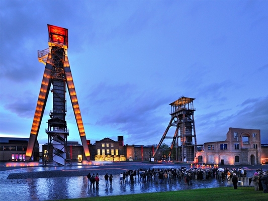 De pleinvloer is gemaakt van zwarte leisteen, qua kleur en textuur refererend aan het ‘zwarte goud’ uit de mijnen. De onregelmatige scherven variëren in afmeting van grote flagstones tot fijn split. De vloer wordt verlevendigd door verlichtingselementen, een waterspiegel, nevelfonteinen en speciaal ontworpen, verwijderbare zitelementen. Bijzondere aandacht is er voor het nachtbeeld, waarbij o.a. de gevels en de schachtbokken worden aangelicht. Alle water- en lichtelementen kunnen via een computerprogramma worden afgestemd op specifieke evenementen. De schachtbokken hebben ook een functie op het plein. Het Belgische bureau NU architectuuratelier ontwierp een attractieve route die door de voormalige mijngangen onder de oudste schachtbok en de ruïne van het ontvangstgebouw doorloopt en eindigt met een fantastisch panorama bovenop de jongste schachtbok.